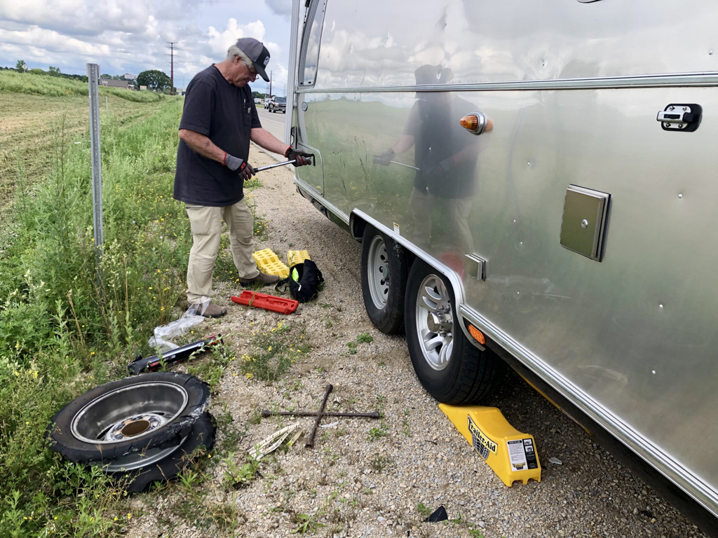 After assessing the ordeal, all was good. Will need to replace the banana wrap behind the wheel, but no body damage. Shout out to Rich Luhr and his handy dandy bag of goodies we purchased at a mid-winter IBT (Airstream event) years ago for tire changes. Along with the Trailer Aid (pictured) we purchased separately, the bag was put to use and we were on our way with a double-cocktail in our future. In checking the tires, production date was 1815 (manufactured the 18th week of 2015). Time for new shoes for the Silver Palace all around!