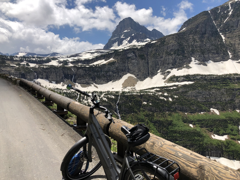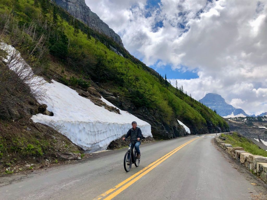 REMEMBER THAT MAGIC TICKET into Glacier National Park? We put it to great use! Within Glacier National Park there is a simply amazing road which connects West Glacier (closest to Whitefish, MT where we camped) to East Glacier. This road is known as the Going-To-The-Sun Road and is so spectacular it made the National Register of Historic Places AND is a National Historic Civil Engineering Landmark. Completed in 1932, this two-lane road ascends, twists, turns and descends over the course of it’s 50 miles which peaks at Logan Pass with an elevation of 6,600 feet. The issue with this stunning road is that it opens late to vehicle traffic, usually late June/early July, due to road clean up and maintenance repairs to clear rocks and mend guard rails lost over the harsh winter. This is what we experienced five years ago while camping in the park and we missed the road opening by a handful of days. However, if you happen to have a bicycle, this is an extraordinary time to ride because the road is open to cyclists and hearty hikers only for a short window of time. And if you have an electric bike, which, by the way, is the ONLY way we could have made this behemoth climb, therein lies the magic of Glacier National Park and Going-To-The-Sun Road.
