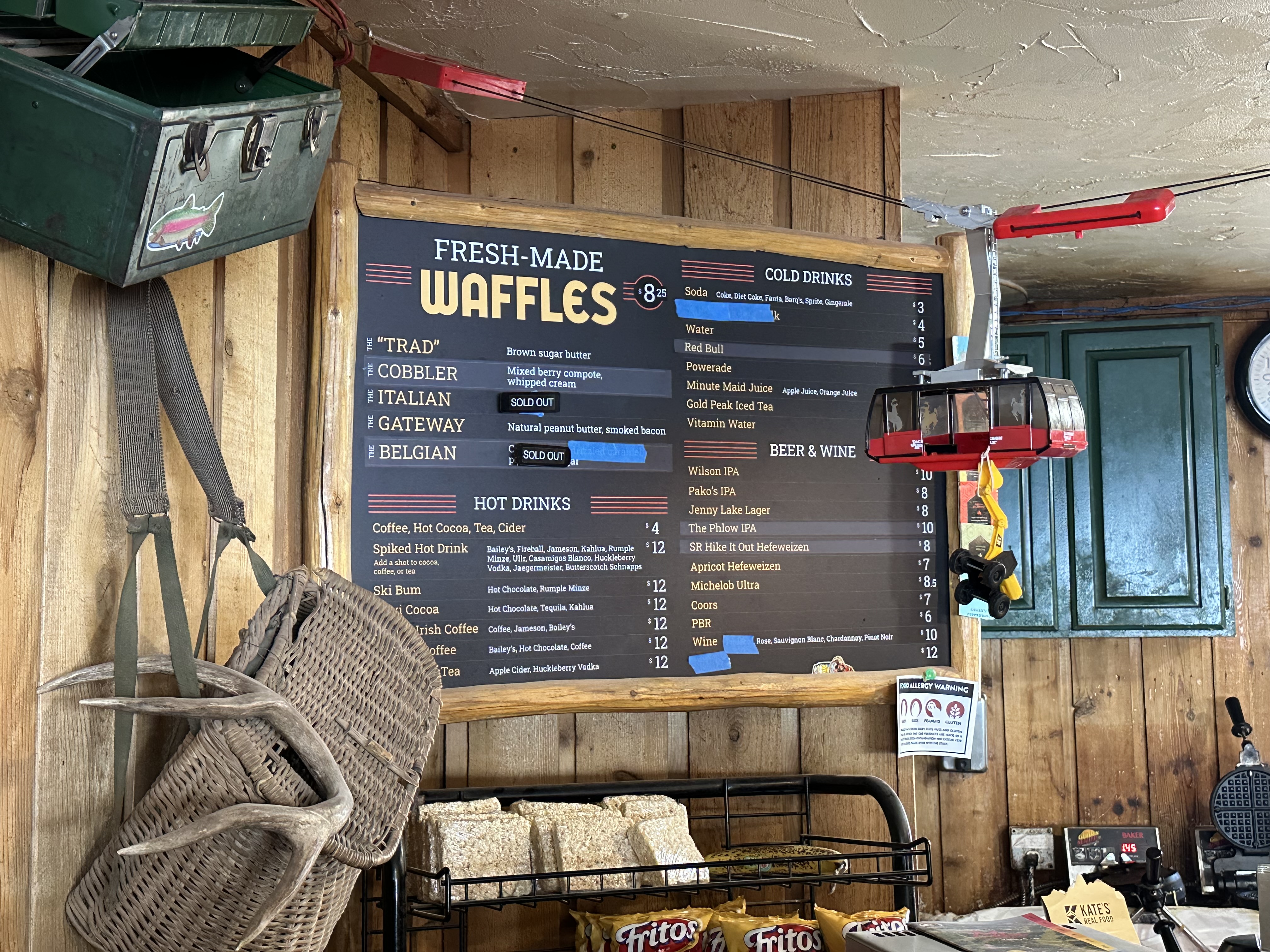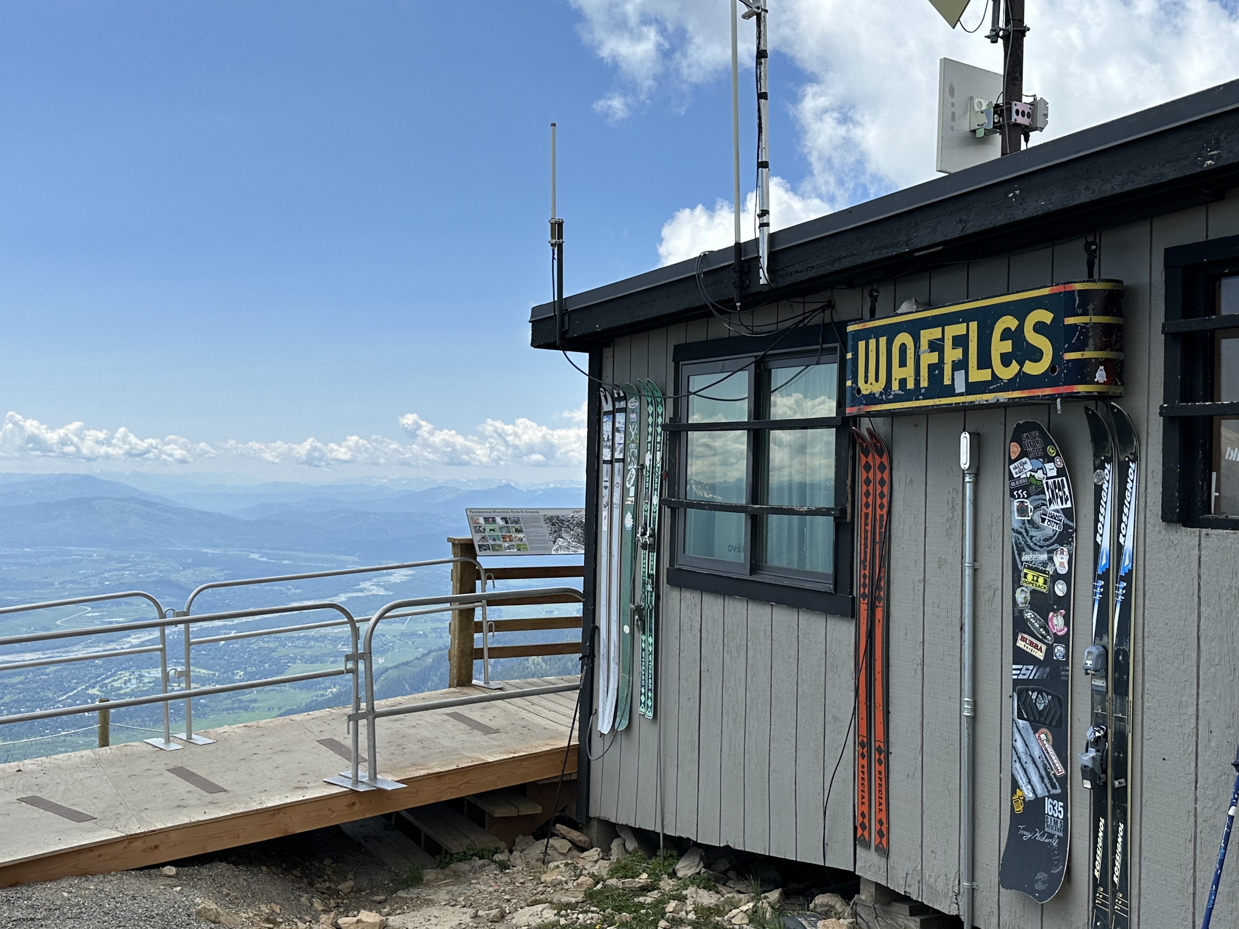 After settling in I drove to Teton Village and up the aerial tram to take in the view atop Rendezvous Mountain. Memories returned to me of my visit in 1981 when I rode the original 1966-era 50-person tram up and walked the seven miles downhill to add to my adventure. To this day I recall stiff knees for a week and I was a whole lot younger! This time it was to take in the mountain top and savor a waffle at 10,450 feet high in the sky at Corbet’s Cabin.