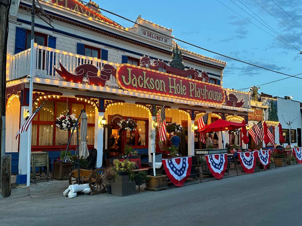 During our last visit to Jackson we enjoyed the Jackson Hole Playhouse and returned again this year to see a lively performance of, ‘Annie Get Your Gun’. The Playhouse is in a building built in 1916 and has housed various businesses over the years including a livery, stage coach company, the Model T Ford dealership, a bowling alley and finally in 1935, the Jackson Hole Playhouse. Dinner prior to the show is always fun as the servers, who are actually the actors, break into song to kick the evening off.