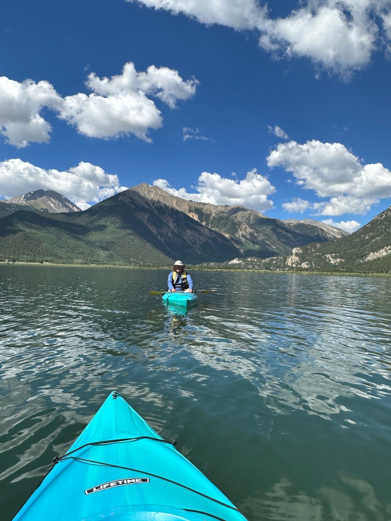 When you camp ON the Twin Lakes in the town of Twin Lakes, you gotta head down to Johnny Canoe on the shore and take a kayak for a paddle. On the water we reminisced about the years we’ve been coming here including several with our Goldens, Tyler & Tucker when we rented a cabin; and now with our mutties, Boone & Piper. Good memories, while new ones continue to be made. Life is good in an Airstream!